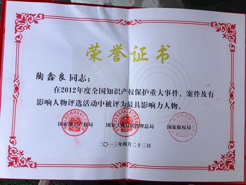 4月23日上午,由国家知识产权局、国家工商行政管理总局、国家版权局发起,中国专利保护协会、中华商标协会和中国版权协会共同组织开展的2012年度全国知识产权保护重大事件、案件及有影响人物评选活动结果在北京揭晓。其中包括党的十八大报告再提实施知识产权战略和加强知识产权保护等10个重大事件、我国产业在磷酸铁锂专利无效行政诉讼案中获胜等10个重大案件及陶鑫良等12名最具影响力人物。