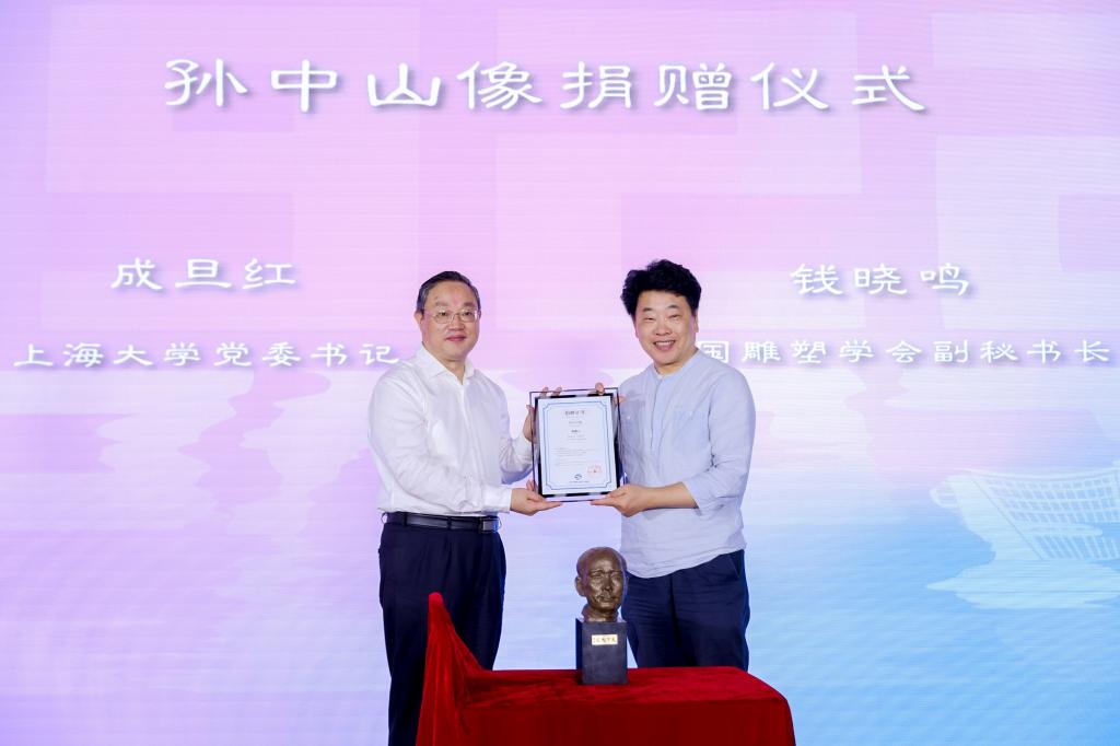 在孙中山像捐赠仪式上,ac米兰官网中文网站党委书记成旦红代表学校接受捐赠,并向捐赠者代表钱晓鸣先生颁发捐赠证书,赠送早期ac米兰官网中文网站校舍模型。