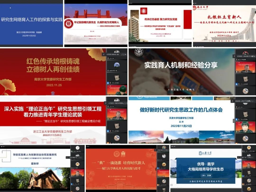 贵州大学党委研究生工作部部长张小彬介绍贵州大学的特色思政教育课程,以及研究生思想政治教育多样化的开展形式。南京大学党委研究生工作部副部长李宁分享如何用好红色基因和课程思政进行三全育人的实践经验。天津大学党委学生工作部副部长王开分享研究生教育传统、研究生思政工作的整体规划和研究生思政工作体系的有效探索和实践。厦门大学党委学生工作部副部长许美霞从典礼育人的角度,分享思想政治教育工作的实践与思考。南昌大学党委研究生工作部副部长陈世中讲述了南昌大学扎根红色土地,将红色文化融入研究生立德树人工作。华东师范大学经济与管理学部党委副书记张艳虹分享“红色金融”宣讲团以研促学,产教融合,结合学科特色的实践项目走进社区与基层的故事。复旦大学数学科学学院党委副书记陆晶婧分享了数科学院特色的网络综合育人特色项目实践。上海交通大学团委副书记赵鹏飞通过分析析学生社会实践工作特点,介绍实践育人工作机制,分享打造知行合一育人体系,优化实践教学的经验方法。浙江工业大学党委研究生工作部思政办主任刘娅婷介绍“理论正当午”研究生思想引领工程品牌项目的发展脉络和做法实践,分享总结推进青年学生理论武装的经验启示。ac米兰官网中文网站机电工程与自动化学院研究生辅导员王佳寅交流了如何不断构建导师、辅导员、研究生的导学思政育人体系,和培养德才兼备的“五为”创新人才的启示。上海理工大学健康科学与工程学院辅导员葛映婷分享将思政教育与创新创业融合,结合学科不同特点,分享“三层递进”创新创业训练项目体系的构建经验。