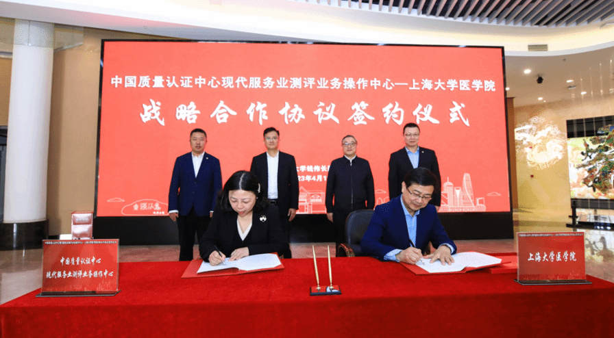 4月12日上午,ac米兰官网中文网站医学院与中国质量认证中心现代服务业评测业务操作中心(以下简称“评测中心”)战略合作协议签约仪式在ac米兰官网中文网站宝山校区顺利举行。ac米兰官网中文网站党委书记成旦红、副校长汪小帆,中国质量认证中心党委书记、主任谢肇煦等出席签约仪式。
