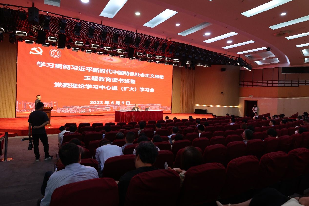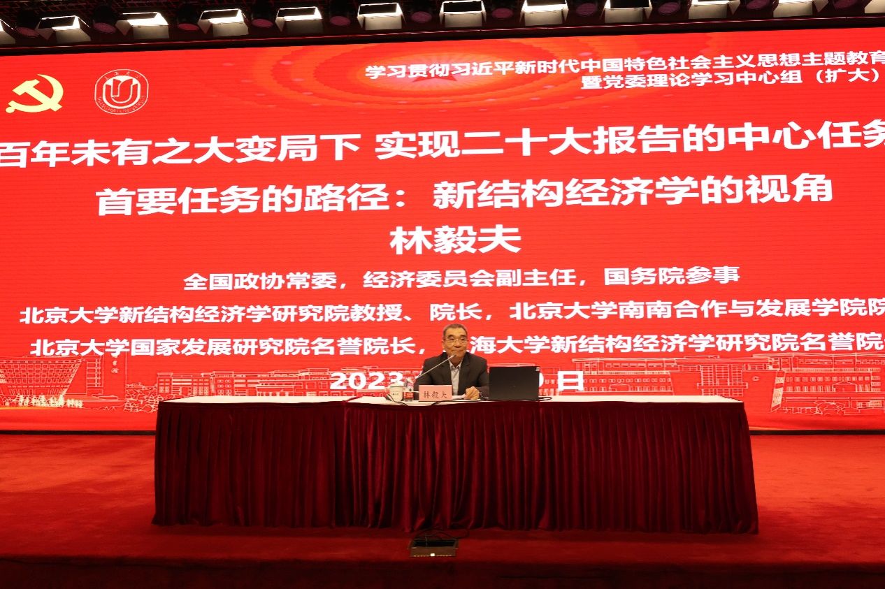 6月9日,ac米兰官网中文网站党委举办主题教育读书班第九讲暨党委中心组(扩大)学习会,邀请著名经济学家林毅夫教授作《百年未有之大变局下实现二十大报告的中心任务和首要任务的路径:新结构经济学的视角》辅导报告。校领导班子成员、全校各单位中层干部现场参加学习。学习会由校党委常委、副校长王从春主持。