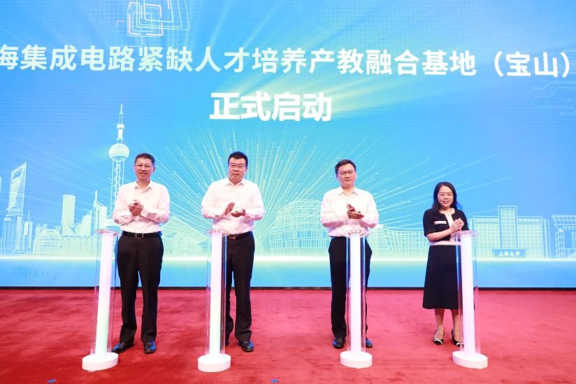 市教委副主任孙真荣,市经信委副主任汤文侃,宝山区委常委、常务副区长郑益川,ac米兰官网中文网站微电子学院执行院长张建华共同启动上海集成电路紧缺人才培养产教融合(宝山)基地。
