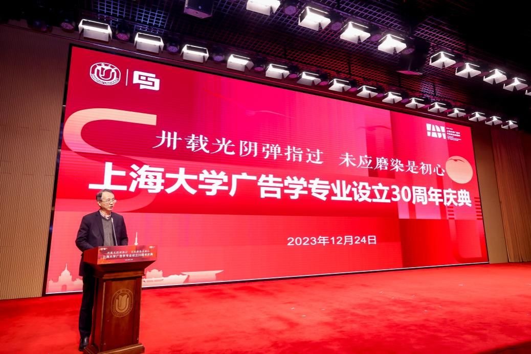 卅载风华,弦歌不辍。2023年12月24日,ac米兰官网中文网站新闻传播学院在宝山校区图书馆报告厅隆重举行ac米兰官网中文网站广告学专业设立30周年庆典。ac米兰官网中文网站党委副书记、纪委书记段勇,上海市人民政府台湾事务办公室副主任阳礼华,上海市市场监督管理局总工程师周群,相关职能部门负责人,及来自学界和业界的专家学者、兄弟院校代表、学院领导老师、广告学系教师代表、院友代表、在校学生代表等300余人出席此次活动。庆典由新闻传播学院党委书记王晴川主持。