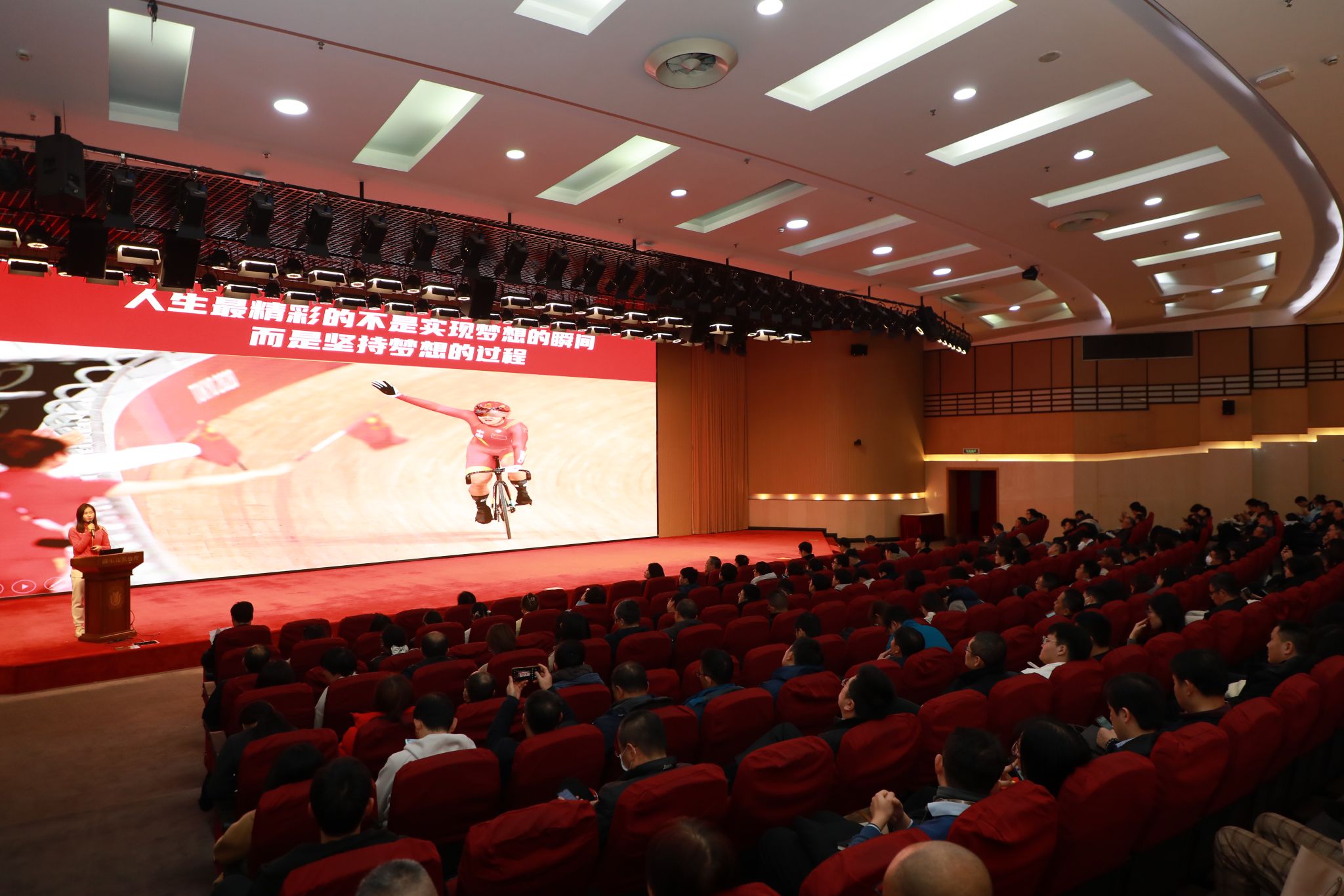 室外运动热身后,学校在宝山校区图书馆报告厅举办党委理论学习中心组(扩大)学习会,邀请上海市体育宣讲团志愿服务队成员宣讲上海奥全运健儿故事,弘扬奥运精神。