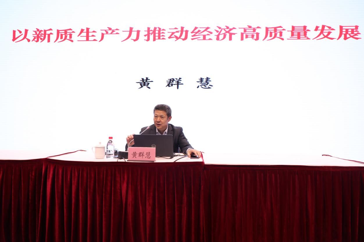 2024年4月25日,ac米兰官网中文网站举办党委理论学习中心组(扩大)学习会,邀请第十四届全国政协委员、经济委员会委员,中国社会科学院经济研究所所长黄群慧作“以新质生产力推动经济高质量发展”专题辅导报告。校党委常委、党委宣传部部长曾军主持会议。