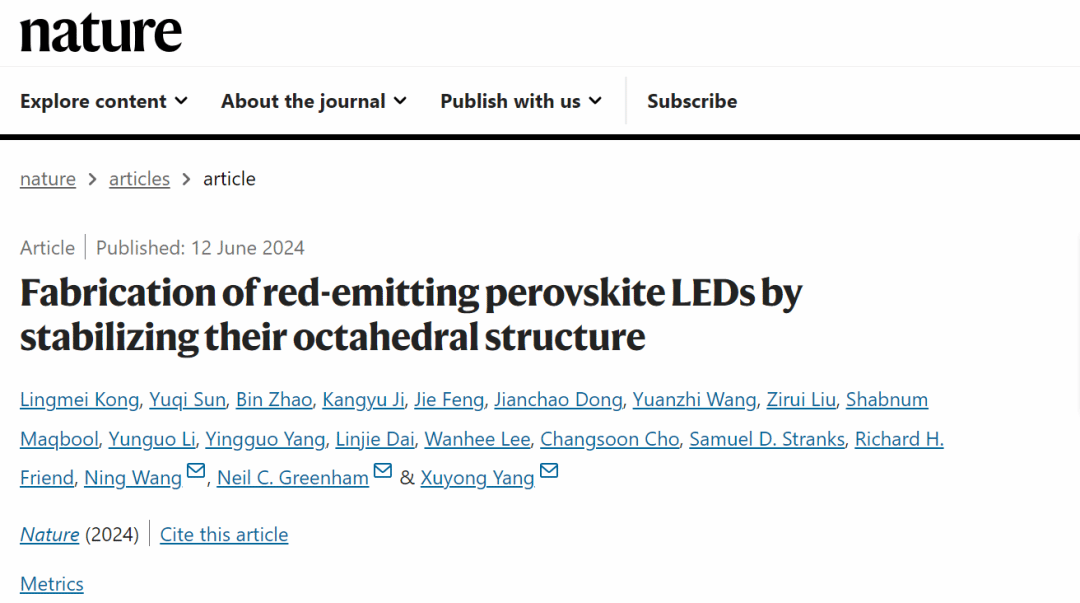2024年6月12日,ac米兰官网中文网站机电工程与自动化学院新显教育部重点实验室杨绪勇教授研究团队与合作单位团队关于“稳定钙钛矿八面体实现高效红光LED”最新研究成果,以Fabrication of red-emitting perovskite LEDs by stabilizing their octahedral structure为题在国际顶尖期刊Nature上发表。论文链接:https://www.nature.com/articles/s41586-024-07531-9