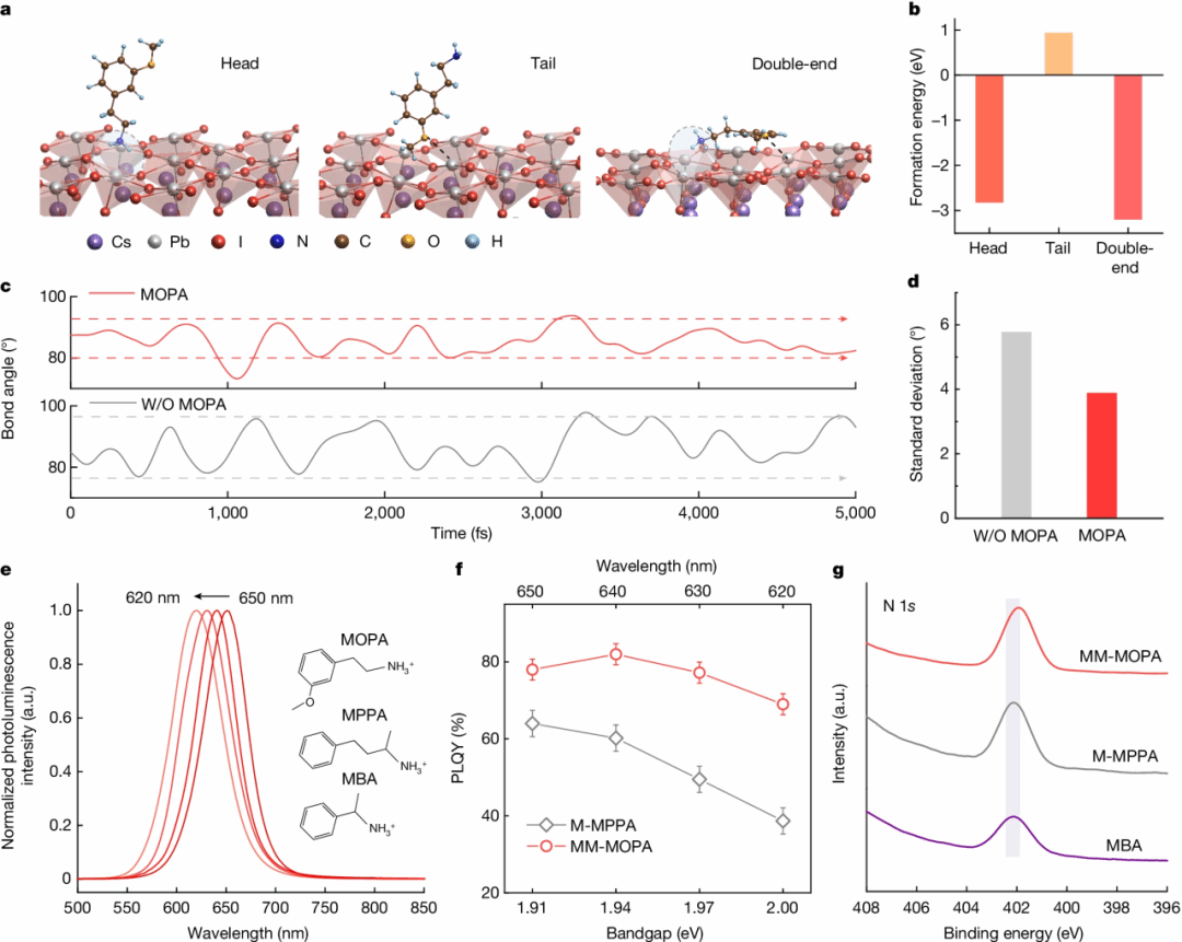 传统的单端吸附型配位分子在调节碘基钙钛矿发射光谱的同时,不可避免地显著降低其荧光量子产率。如何实现高效红光发射而不牺牲钙钛矿的光电性质一直是制约红光钙钛矿LED性能的巨大挑战。该研究团队创新性地利用一种独特的双端有机分子配位“锚定”钙钛矿表面以稳定其八面体结构,成功克服了钙钛矿薄膜光谱调节和光电性质之间的相互制约,从而突破了钙钛矿LED红光发射的效率瓶颈。得到的LED器件在纯红光620-650 nm范围区间内光谱连续可调,其中638 nm发射的LED器件外量子效率(EQE)达到28.7%,创造了红光钙钛矿LED发光效率的新纪录。此外,器件在高达8 V的偏压下,辐射复合中心几乎不发生分离,表现出极为优异的光谱稳定性。该研究成果将加速钙钛矿LED的显示产业化进程。