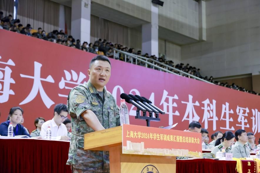 上海警备区党委常委、战备建设局大校局长吴美宝,军训师师长、73181部队上校副政治委员鲍俊成,宝山区人民武装部上校副部长许书奇,校领导成旦红、刘昌胜、胡大伟、聂清、王从春、沈艺、曾军,学校相关部处、学院领导以及全体军训师指战员出席了此次军训成果汇报暨总结表彰大会。