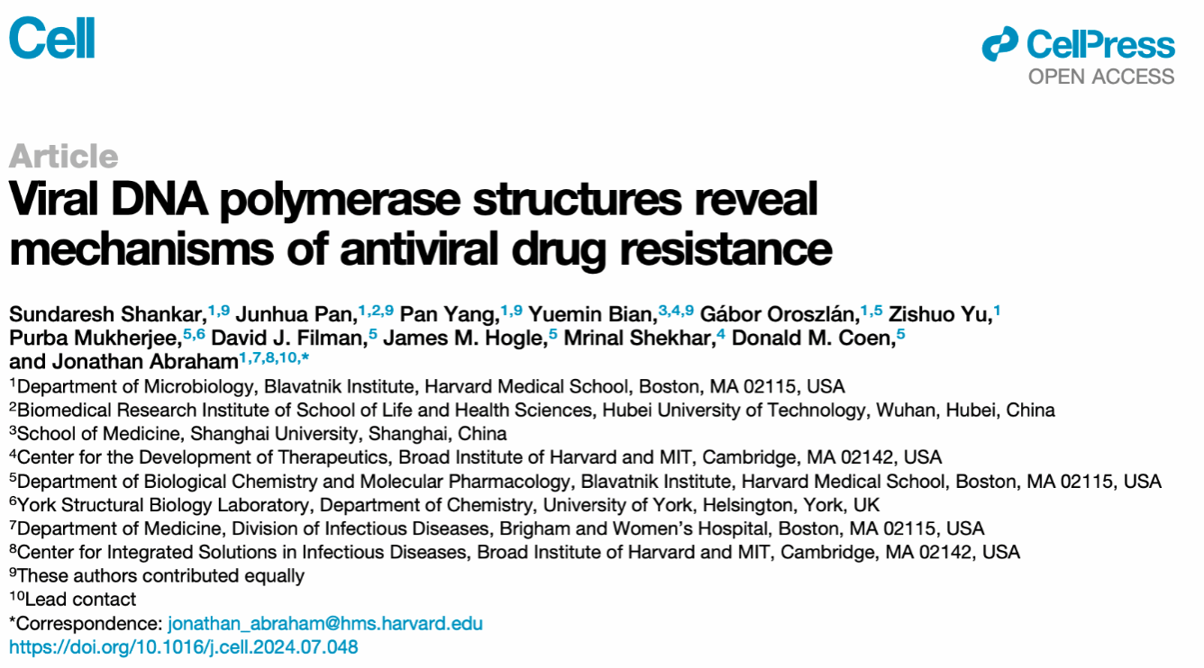 2024年8月27日,ac米兰官网中文网站医学院卞月珉教授与美国哈佛大学医学院JonathanAbraham教授团队合作,作为共同第一作者,在国际顶级期刊《Cell》上发表题为Viral DNA polymerase structures reveal mechanismsofantiviral drug resistance的研究论文。论文链接:https://doi.org/10.1016/j.cell.2024.07.048