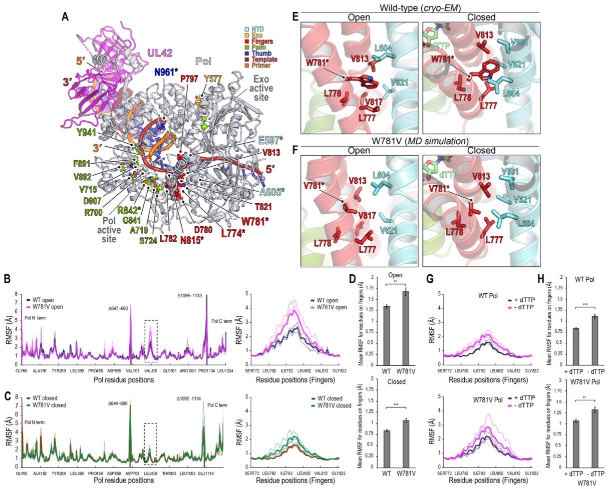 相关工作直观展示了催化亚基Pol和过程因子UL42如何结合DNA以促进持续的DNA合成。值得指出的是,在没有引入核苷酸的情况下,Pol处于多种构象中,手指域处于闭合状态;而与药物结合的结构揭示了抗病毒药物对处于闭合构象聚合酶的亲和力与选择性。此外,分子动力学模拟和抗药性突变体的冷冻电子显微镜结构表明,相关抗性突变是通过调节构象动态以实现对药-靶相互作用的阻碍,而不是直接影响药物结合,从而阐明了导致药物选择性的机制。