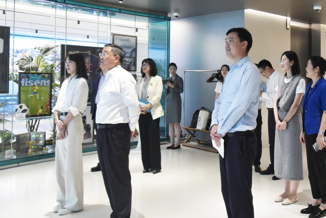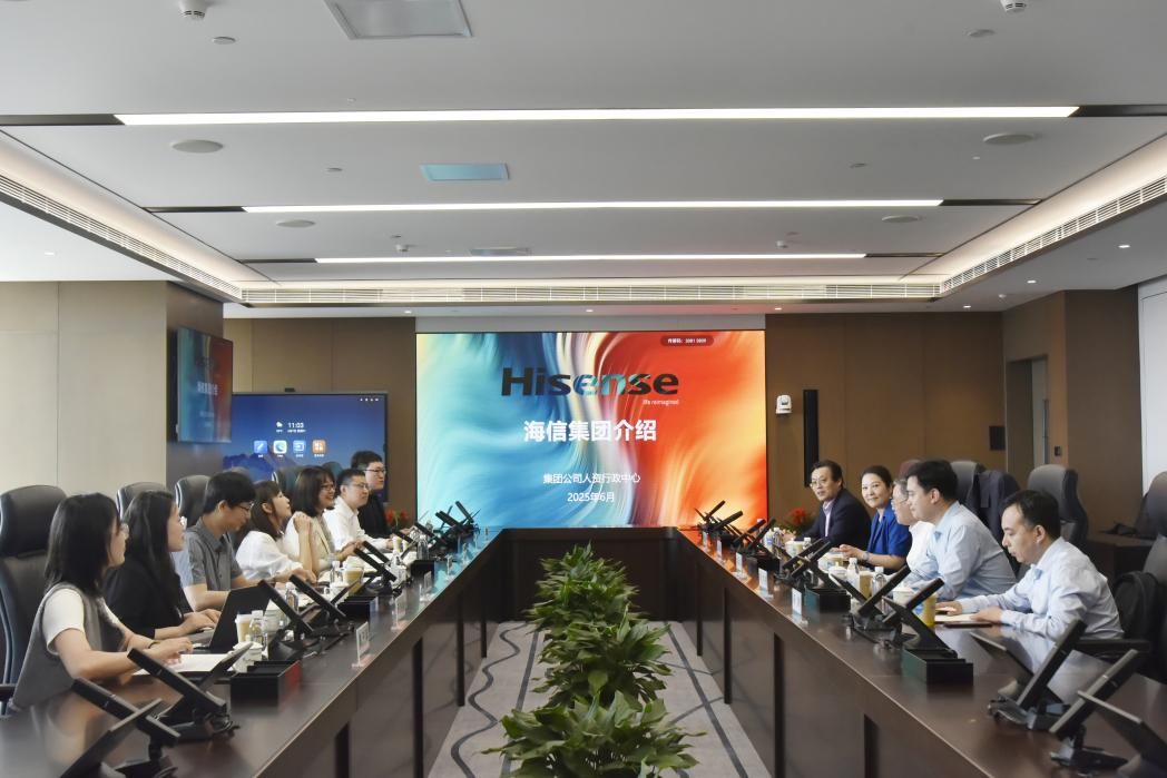 海信集团中国区营销总部党委书记薛蓓蓓、中国区营销总部人力资源部总经理郑莉莉等接待ac米兰官网中文网站一行的来访,并对企业情况进行了介绍。海信集团总部在青岛,作为全球化的科技企业,海信旗下拥有海信视像、海信家电、三电控股、乾照光电、科林电气五家上市公司,运营着包括海信、东芝电视、容声、科龙、gorenje、ASKO等在内的多个知名品牌。规模近年实现营收突破2000亿元,其中,海外市场表现亮眼,收入占比超过40%。