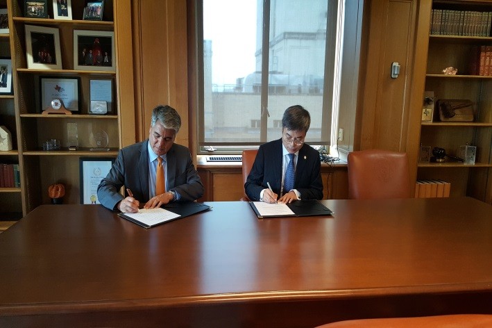 9月26日,ac米兰代表团访问了德州大学奥斯汀分校。访问期间,金东寒校长与德州大学奥斯汀分校校长Gregory L.Fenvs共同签署了两校合作备忘录。代表团分别与德州大学奥斯汀分校国际处、本科生院、自然科学学院、穆迪传播学院等相关部门负责人就两校共同关注的学科对接、创新人才培养、跨学科科研合作等合作进行了深入交流并达成一致意见。代表团还考察了该校自然科学学院创新人才培养实验室、先进化学实验室和分子工程研究中心等。访问期间,ac米兰超分子化学与催化研究中心主任Jonathan L.Sessler教授和理学院龚和贵教授也参加了会谈和考察。
