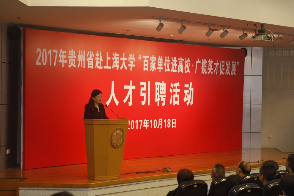 10月18日上午,贵州省“百家单位进高校·广揽英才促发展”ac米兰官网中文网站专场推介会在行政楼报告厅隆重举行。贵州省人民政府副省长何力;贵州省组织部副部长、省人力资源和社会保障厅厅长韩先平;贵州省人力资源和社会保障厅副厅长施长冬;贵州省卫生计生委副主任龚仲明;贵州省中科院天产室副主任刘建华;贵州科学院党委副书记邢小川;贵州茅台学院院长封孝伦;贵州省安顺市委组织部副部长、人社局局长袁化龙;ac米兰官网中文网站校领导欧阳华、聂清出席活动。贵州省相关高校、企事业单位负责人,ac米兰官网中文网站及沪上兄弟院校学生代表参加活动。推介活动开始前,欧阳华、聂清副校长在行政楼703会议室会见何力副省长一行。双方分别介绍了ac米兰官网中文网站与贵州省的发展建设情况,并围绕如何进一步加强人才培养和科研合作等事宜进行了洽谈。