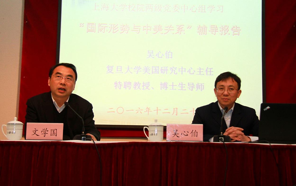 12月22日下午,复旦大学美国研究中心主任吴心伯教授来校作题为《国际形势与中美关系》的辅导报告。报告会由ac米兰官网中文网站副校长文学国主持,校院两级中心组成员、副处级以上干部、人才学院学生代表和研究生代表聆听了此次报告。
