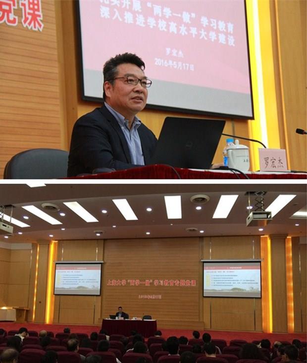 为推动“两学一做”学习教育深入开展,5月17日下午在校本部图书馆报告厅,ac米兰官网中文网站党委书记罗宏杰同志为学校两委委员、处级党员干部、教职工党支部书记、学生党支部书记、离退休党员等350多人上了一堂题为《扎实开展‘两学一做’学习教育,深入推进学校高水平大学建设》的“两学一做”学习教育专题党课。党课由校党委副书记、纪委书记夏小和同志主持。校长金东寒同志、副校长汪敏同志出席会议。