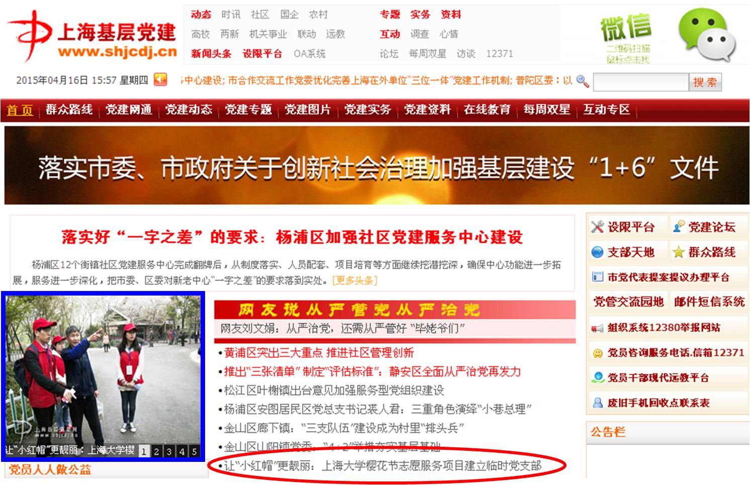 4月16日,上海市基层党建网(http://www.shjcdj.cn/)首页以《让“小红帽”更靓丽:ac米兰官网中文网站樱花节志愿服务项目建立临时党支部》为题,报道了ac米兰上海樱花节志愿者临时党支部工作。为把党建开展到最活跃的“细胞”上,在校党委组织部、校学工办、校团委的关心指导下,本次由社科学院、美术学院以及经济学院联合主办的2015上海樱花节志愿服务工作中,首次成立了临时党支部,24名党员志愿者在志愿服务中不仅传播了树立文明新风尚的正能量,更带动了全体志愿者把更优质的服务奉献给他人,树立了党员先锋模范良好形象,获得游客及社会的广泛赞许。
