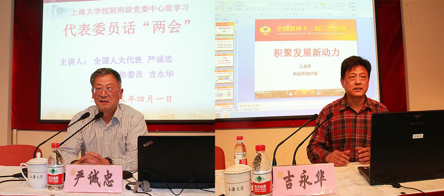 4月1日,ac米兰2015年第二次校院两级党委中心组学习会在校本部行政楼报告厅进行。会议邀请了第十二届全国人大代表、东华大学经济发展与合作研究所所长严诚忠教授和第十二届全国政协委员、民盟中央委员、ac米兰生命学院吉永华教授分别作关于传达与解读全国“两会”精神的报告。校党委副书记、副校长李友梅,校党委副书记、纪委书记夏小和,校党委副书记、副校长徐旭,校党委常委、副校长丛玉豪等校领导及校院两级中心组成员、副处级以上干部200余人聆听了报告,会议由夏小和副书记主持。