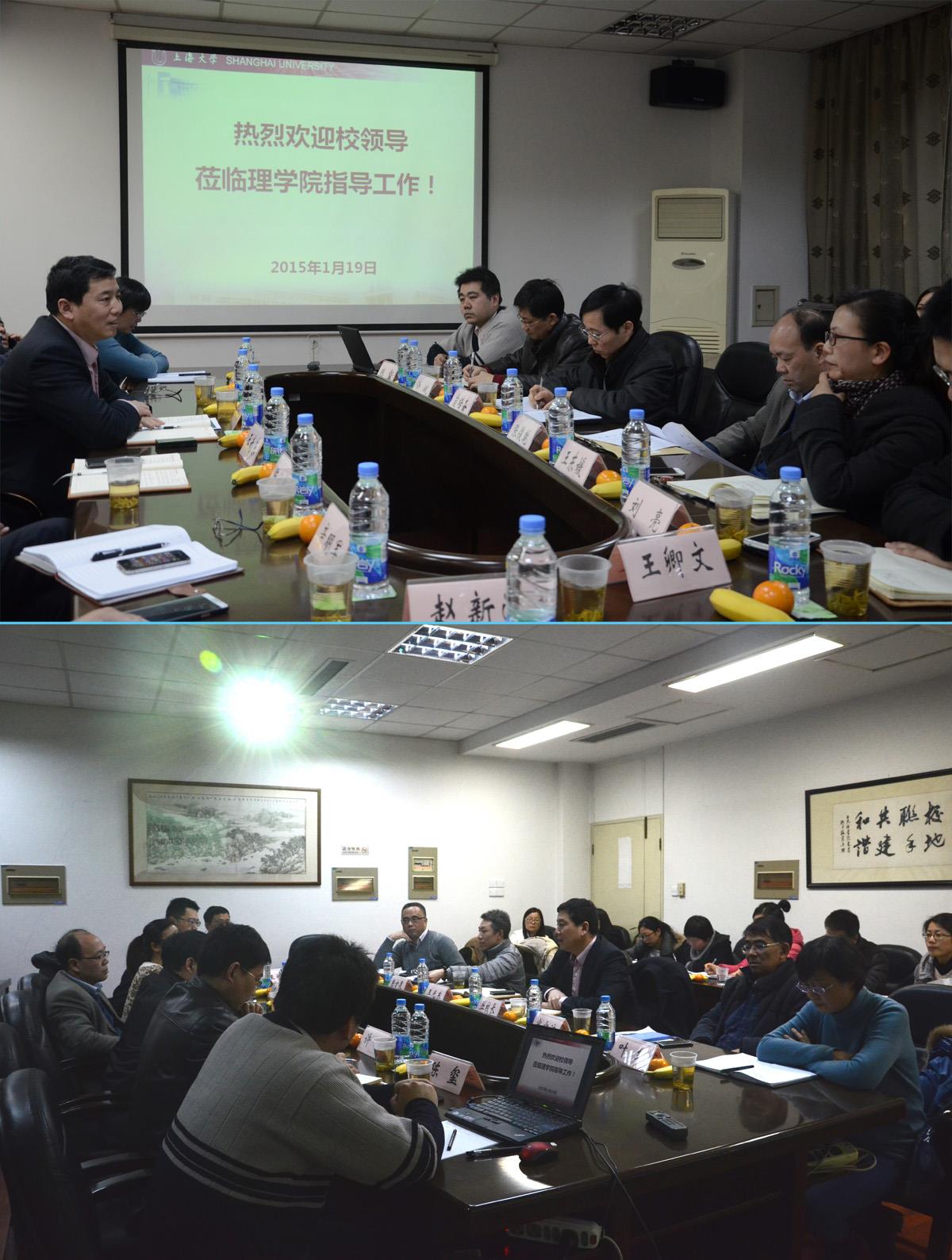 2015年1月19日下午2点,ac米兰官网中文网站党委常委、副校长丛玉豪率相关部处一行到理学院调研本科教学和人才培养。教务处处长王光东、常务副处长陈方泉、招毕办主任叶红、考评办主任辛明军、原社区学院常务副院长宋少沪;以及校党委常委、理学院执行院长翁培奋、理学院党委副书记王东媛、刘亮、副院长陈玺、各系主任、教学副主任和教学管理团队出席了调研会。