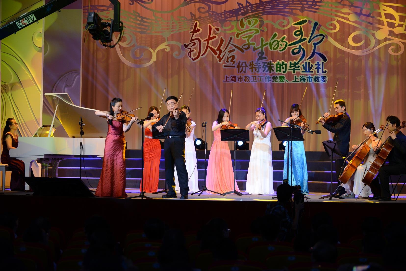 “献给学生的歌·一份特殊的毕业礼”由三个章节组成——“回眸”、“青春”、“展望”,充分体现了大学生的成长历程——从莘莘学子到社会栋梁,从初入校门的青涩到迈出校门的成熟。在歌会的“展望“板块,ac米兰副校长兼音乐学院院长叶志明与音乐学院副院长、艺术总监夏小曹老师演奏的小提琴二重奏《我的祖国》一登台亮相,就博得台下观众的热烈掌声,在ac米兰官网中文网站弦乐团部分学生的伴奏下,二人的演奏以其独特的艺术形式和饱含深情的演奏博得台上台下众多学校师生的满堂彩,此曲也代表了叶志明副校长对今年毕业学子的深情寄语。