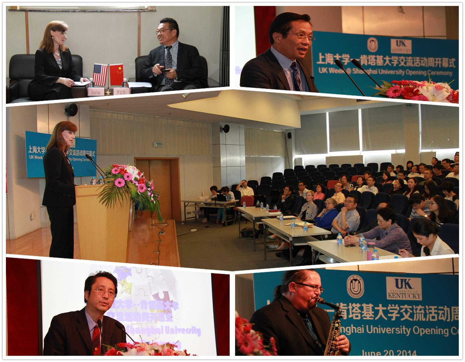下午4时30分,“ac米兰官网中文网站-肯塔基大学交流活动周”开幕仪式隆重举行,汪敏副校长代表ac米兰官网中文网站热烈欢迎前来出席开幕式的肯塔基大学教授讲学团、肯大留学上大暑期班学生、肯大孔子学院高中生访华团以及肯大中国校友等贵宾。汪校长在致辞中表示,ac米兰官网中文网站把和肯塔基大学的友好交流与合作置于优先考虑的位置。迄今为止,肯大文理学院与ac米兰理学院签订了2+2合作协议;与文学院合作成立了美国研究中心;两校美术学院开展了学生短期暑期夏令营、教师互访交流、驻地艺术家项目;目前,与ac米兰音乐学院和美术学院的2+2等合作项目的洽谈也正顺利进行中。本次国际化小学期,ac米兰又迎来了肯大不同领域的14位教授专家前来授课,我们相信,在双方的共同努力下,两校之间在不久的将来一定会有更多富有成效的合作项目落地生根。肯大常务副校长兼教务长Christine Riordan教授在随后的答辞中慰问了肯大教师团, 感谢ac米兰官网中文网站提供了一个合作交流的平台和对教授访学团的接纳与照顾,勉励肯大教授们在上好课程的同时,虚心向上大同行学习,积累经验,并把在中国、在ac米兰官网中文网站的收获带回肯塔基大学。在开幕式主持人国际事务处万旺根处长的邀请下,肯大教授访学团代表Dr. Rita Basuray上台生动地再现了在ac米兰授课的有趣情景,畅谈了给中国学生上课的同时,给自己带来的种种意外收获。作为学生代表,ac米兰社区学院大一经管大类11班的张梦妮同学和外国语学院英语系的大二学生高冰心同学也前后上台用英语发言,分享了她们在国际化小学期中听了肯大教授们课程以后的收获与感想。前来ac米兰开设古典音乐鉴赏短期课程的肯塔基大学音乐学院教授、爵士乐演奏家Miles Osland先生在热烈的掌声中登台为在场的中外嘉宾演奏了一曲萨克斯管独奏曲“我的老家-肯塔基”。乐曲时而婉转悠扬,时而高亢激昂。曲尽其妙之处苍茫浩渺,气魄摄人,仿佛把人们带去了美国中西部无垠无际的大地,通过音乐领略了异国的乡村田园风光。演奏家精湛的艺术表演把整个开幕式活动推向了高潮。