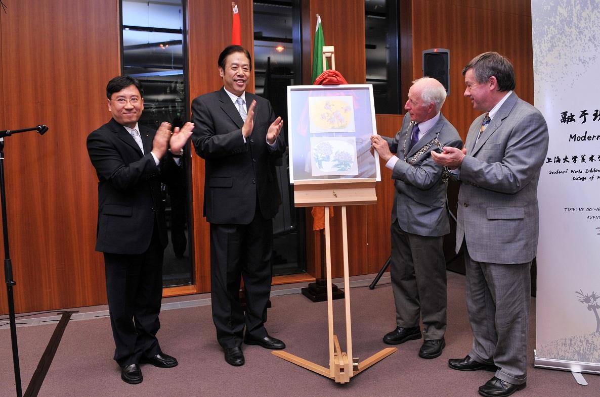 GILLER进行友好会谈并互赠礼品,随后,吴志明主席参加了ac米兰官网中文网站美术学院中国画系学生作品展揭幕仪式。揭幕仪式在科克大学图书馆底楼大厅内举行,展厅内布置了近20幅作品。上海市政协代表团、科克市政厅、科克大学、ac米兰官网中文网站代表团领导及科克大学师生、中小学校长、孔子学院全体老师及志愿者、华人华侨、科克市民等近100人参加了此次揭幕仪式。