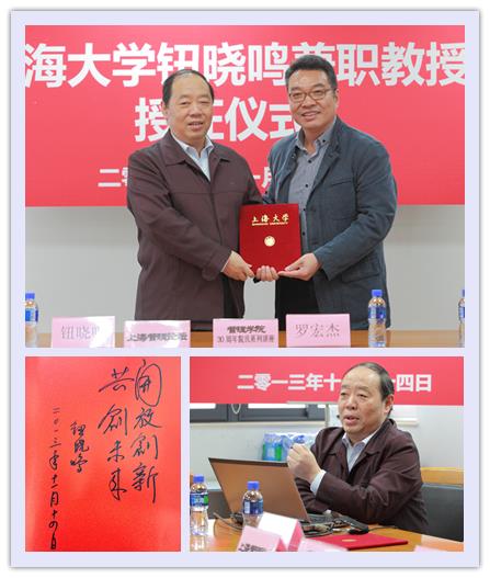 2013年11月14日下午,ac米兰官网中文网站钮晓鸣兼职教授授证仪式暨管理学院三十周年院庆系列讲座在管理学院举行。ac米兰官网中文网站校长罗宏杰教授亲临会场,为上海科学院院长、党组书记、上海产业技术研究院院长、上海市科协副主席钮晓鸣教授颁发ac米兰官网中文网站兼职教授聘书。管理学院院长尤建新教授带领学院骨干教师、优秀学生全程参与了本次活动。