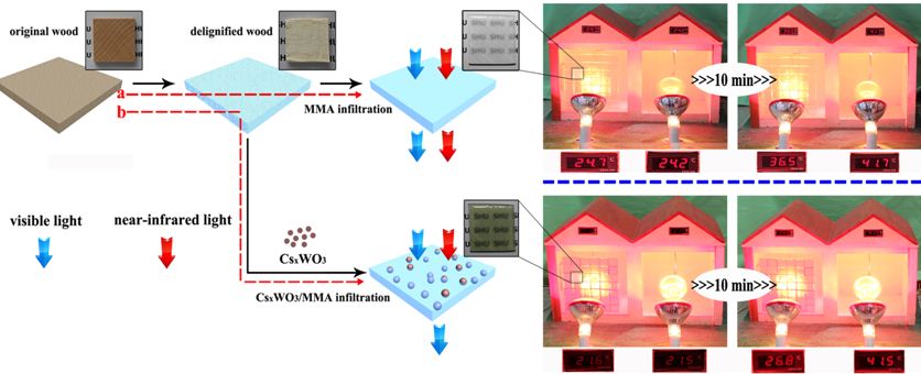上图:模拟太阳光连续辐照0,3,10分钟后引起(左边)掺有CsxWO3的透明木头窗室内与(右边)普通玻璃窗室内温度变化