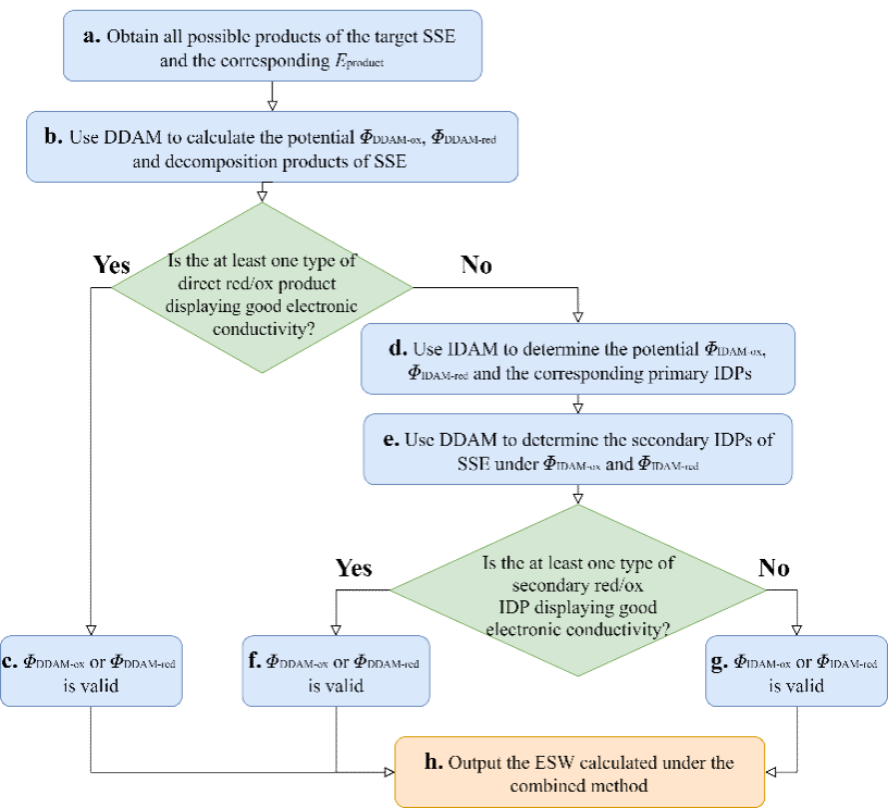ESW是以SSE的氧化电势为上限,还原电势为下限的电势区间,该区间指示了SSE正常工作的电势范围。传统的ESW分析方法分为DDAM和IDAM,其中DDAM以特定电势下的巨势高低判断SSE的分解电势及分解产物。而IDAM认为SSE在维持原结构的情况下进行移动金属原子的嵌入/脱出是动力学上最有利的还原/氧化反应。DDAM和IDAM仅分别适用于热力学和动力学有利的电化学分解分析,为提高分析预测精度,文章将二者融合,通过SSE分解产物的电子电导率动态判断热力学或动力学有利的分解路线,算法流程如图2所示。