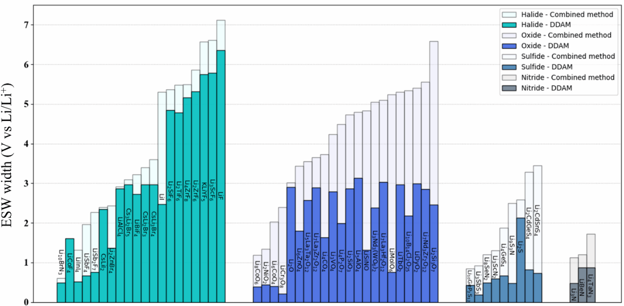 为了筛选兼顾优良离子电导率和宽ESW的潜在优异SSE,作者通过融合方法对该课题组先前发掘的328种Li快离子导体(Eb小于0.7 eV,RT大于0.05 nm)进行电化学稳定分析,纠正了54种被DDAM低估的材料的ESW预测值,结果如图3、图4所示。