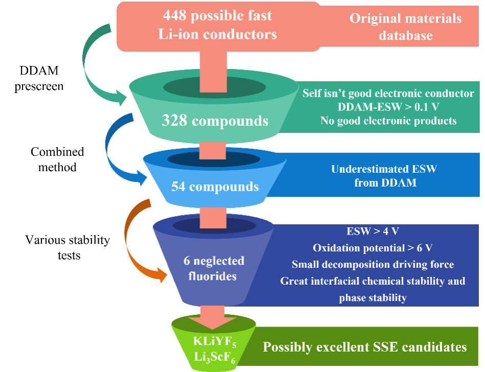 该论文提出了一种融合DDAM和IDAM的高精度ESW分析方法,并基于此方法对该课题组先前所发掘的Li快离子导体的ESW进行高通量计算,结果与现有实验数据一致。其中有6种以前未被报道过的材料展现了宽ESW、较高抗氧化电势及优异的相稳定性和界面稳定性,是具有一定应用潜力的固态电解质。计算筛选过程如图1所示。