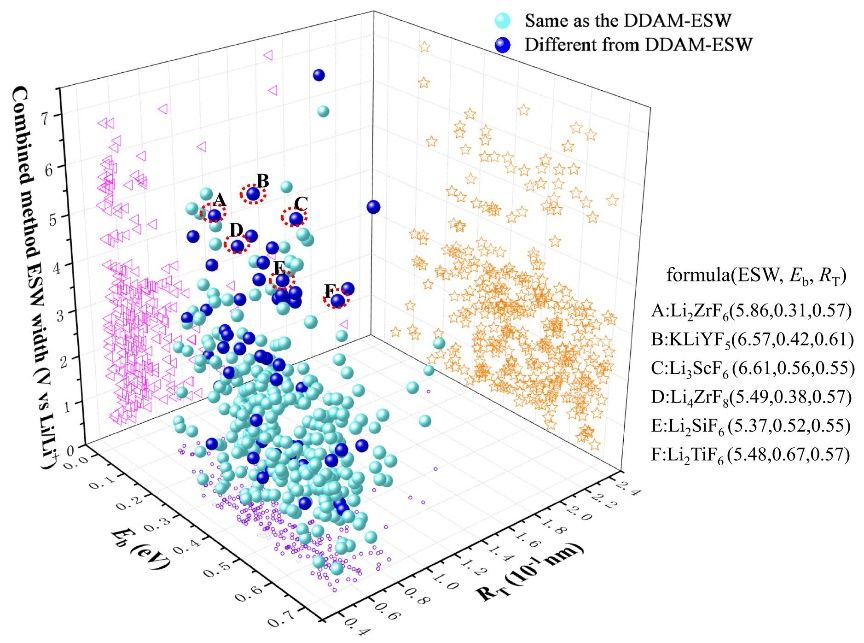 浅蓝色点表示融合方法的预测ESW宽度与DDAM的相同,反之为深蓝色点。相应二维投影点显示为左侧的粉红色三角形、右侧的橙色五角星和底部的紫色圆圈。两个横轴上的RT和Eb分别为SSEs自由传输的最大离子的半径和BVSE能垒。纵轴为融合方法预测的ESW宽度。6种性能优异的筛选化合物表示为A-F,其RT、Eb和ESW宽度标记在右侧。
