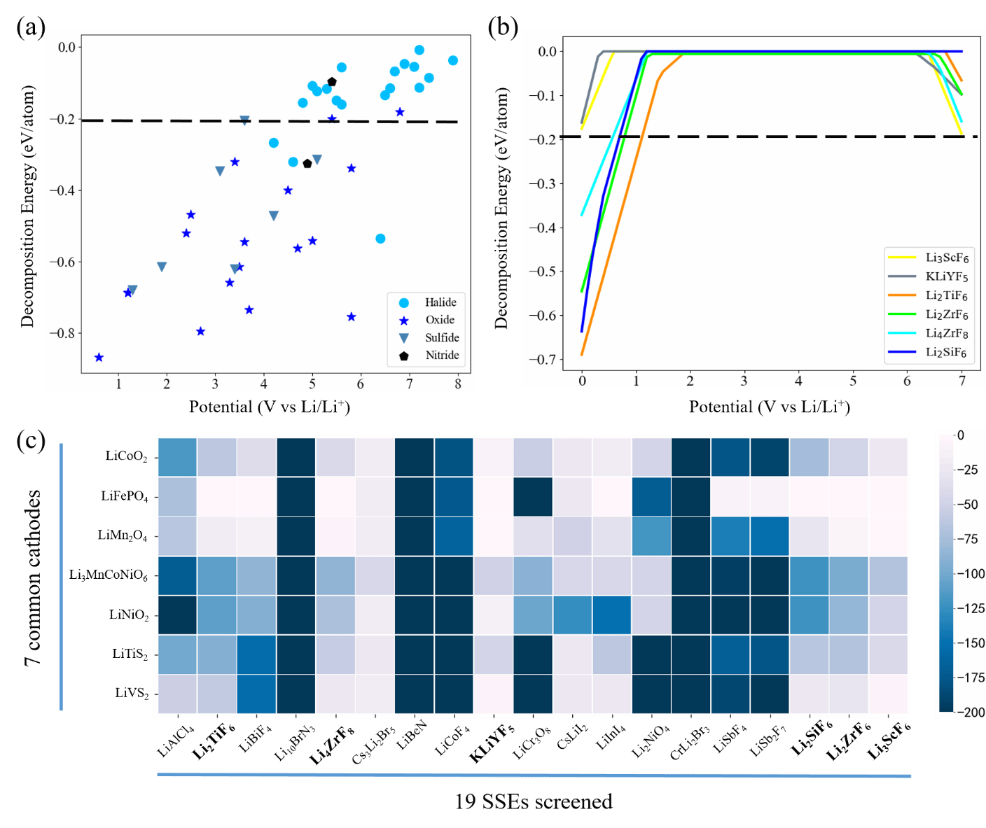 文章将筛选的重点放在ESW被低估的材料上,进一步对其进行了分解能、相稳定分析和电极-电解质稳定性分析。部分电解质具有较低的分解能,如图6a、6b所示,其中有6种预测性能优异的氟化物从前未被作为SSE重点报道和研究。它们呈现出4 V以上的宽ESW、较高的抗氧化电势(大于6 V)、优异的相稳定性(凸包能小于1 meV/atom)和界面稳定性(与七种常见电极的界面反应能低于150 meV/atom,如图6c所示)。