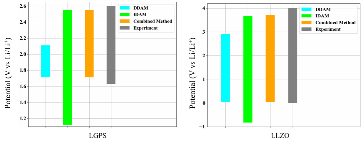 图5. Li10GeP2S12(LGPS)与Li7La3Zr2O12(LLZO)在DDAM、IDAM和融合方法下的预测ESW与实验测量结果对比图。