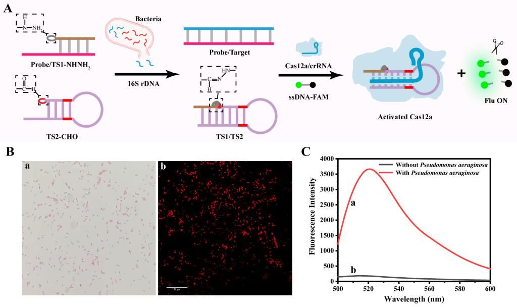 该研究工作通过采用腙化学和巧妙的核酸序列设计,利用互补碱基配对引起的邻近效应加速整个激活链的形成,从而快速有效地激活CRISPR/Cas12a系统,并进而提出了一种简单而灵敏的铜绿假单胞菌分析方法。