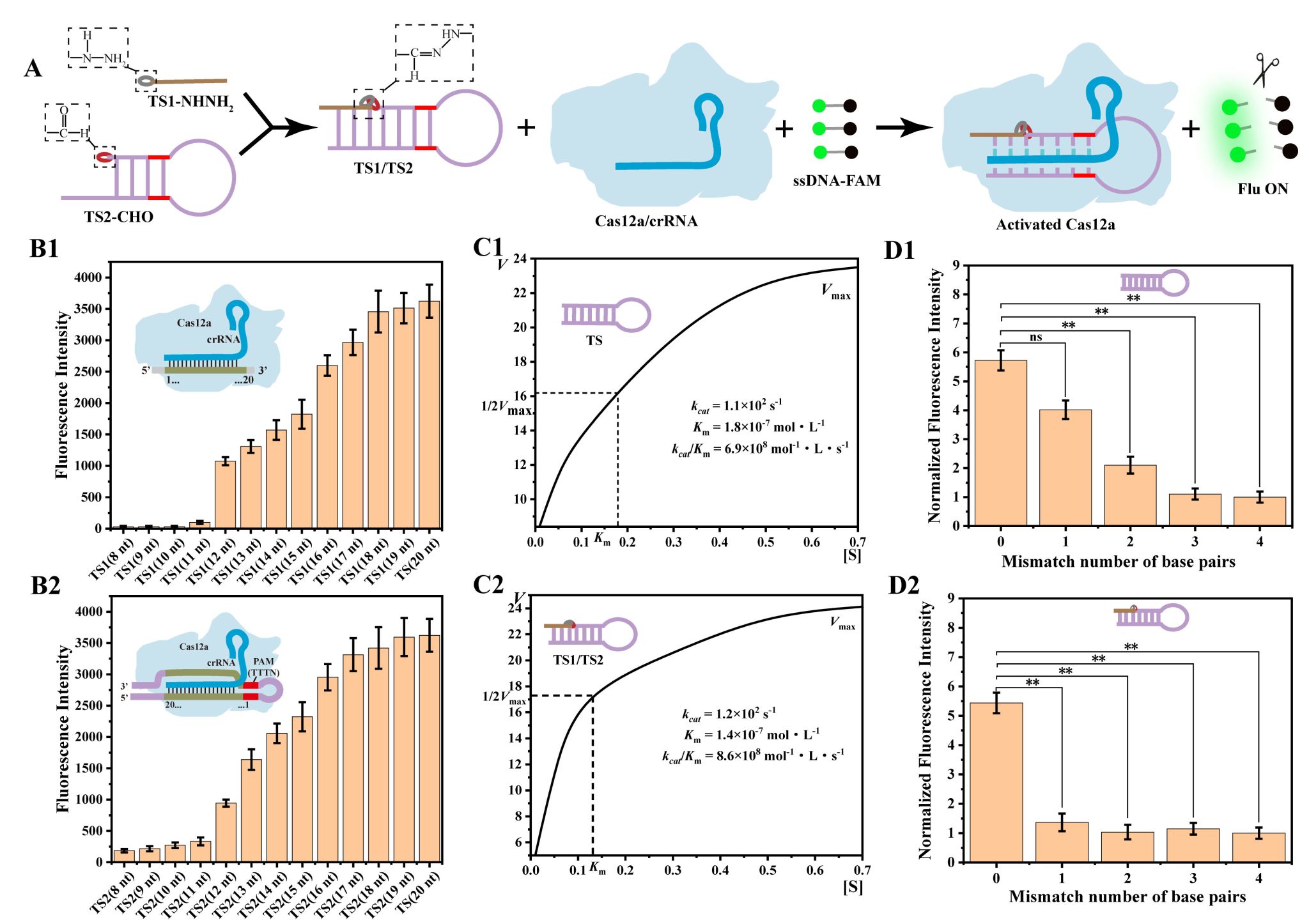 为了将腙化学应用于CRISPR/Cas12a系统中,研究团队巧妙地将激活链设计为发夹结构的两个片段,并分别由酰肼和醛基两个腙连接基团修饰。在碱基互补配对的作用下,含有酰肼基团的TS1更容易与修饰醛基基团的TS2链通过腙键反应形成完整的TS1/TS2链。激活的Cas12a/crRNA复合体的反式裂解活性导致ssDNA-FAM的任意切割和荧光恢复(图1)。腙化学的引入可以提高CRISPR/Cas12a系统的特异性,可以有效区分目标序列中的单碱基错配。