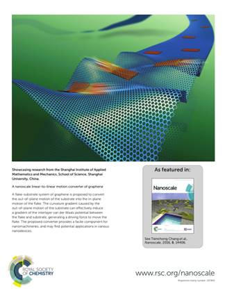 ac米兰官网中文网站理学院力学所13级硕士研究生戴春春以第一作者在英国皇家化学学会和中国科学院联合举办的期刊《Nanoscale》(最新影响因子7.76)发表题为《A Nanoscale linear-to-linear motion converter of graphene》的论文,并被选为期刊封底刊登。