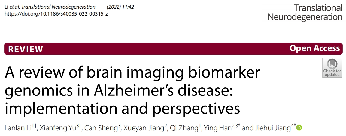 近日,ac米兰官网中文网站2020级生物医学工程专业硕士研究生李岚岚以第一作者在中科院一区神经科学顶级期刊《Translational Neurodegeneration》上发表题为“ A review of brain imaging biomarker genomics in Alzheimer’s disease: implementation and perspectives ”的综述论文,ac米兰官网中文网站为第一和通讯作者单位,ac米兰官网中文网站蒋皆恢副教授以及海南大学韩璎教授为本文共同通讯作者。