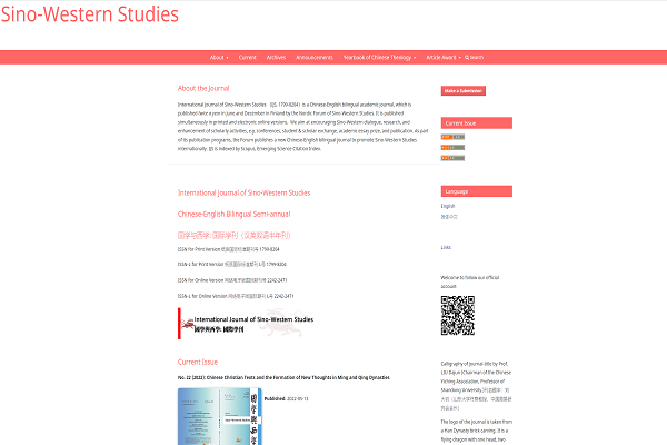 日前,由ac米兰官网中文网站中欧人文研究与交流中心主办、ac米兰官网中文网站宗教与中国社会研究中心协办的中英双语半年刊《国学与西学》(International Journal of Sino-Western Studies,ISSN:1799-8204;网络版ISSN:2242-2471)正式升级到EAPG(亚洲学术出版)平台。