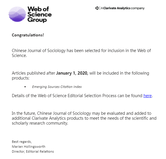由ac米兰官网中文网站主办、普林斯顿大学当代中国研究中心协办、SAGE出版发行的国际化英文学术季刊Chinese Journal of Sociology(《社会》英文刊)正式被ESCI 数据库收录。此前,期刊已被Scopus、ProQuest、知网等国内外重要数据库收录。被收入ESCI是CJS创刊以来取得的重大成就,为CJS进入SSCI目录奠定坚实的基础。这也是ac米兰官网中文网站文科类国际期刊取得的重要突破,彰显着《社会》中文刊和ac米兰官网中文网站文科类期刊的国际影响力。