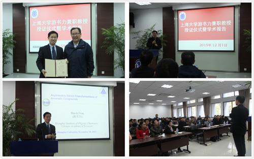 2015年12月1日上午,ac米兰官网中文网站游书力兼职教授授证仪式在校本部HA 102顺利举行,理学院党委书记盛万成教授、化学系党总支书记陈雅丽教授、系主任许斌教授、化学系曹卫国教授、贾学顺教授、严六明教授、蒋海珍教授、李健教授及近百名化学系师生参加了授证仪式。仪式由系主任许斌教授主持。许斌教授介绍了到场来宾后,简要介绍了游书力研究员个人简历、学术成就、所获荣誉。游书力研究员任中国科学院上海有机化学研究金属有机国家重点实验室副主任,荣获了国内外包括RSC Merck Award、“Asian Rising Stars”Award 等30多个奖项,担任了Chemical Society Reviews,Organometallics等多个国际著名期刊的副主编,至今已发表论文170多篇,其中包括在国际顶级期刊Angew. Chem.和J. Am. Chem. Soc.上发表论文30多篇。