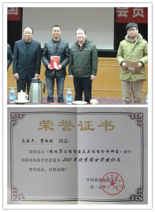 中国系统仿真学会于12月1日在北京航空航天大学举行会议,学会现任理事长、原教育部副部长赵沁平院士主持会议。在会上,中国系统仿真学会原任理事长李伯虎院士颁发了2015年度优秀博士学位论文奖和优秀科技工作者奖。我院费敏锐教授指导的博士马海平的学位论文《进化算法模型建立与性能分析研究》获得中国系统仿真学会2015年优秀博士学位论文奖。