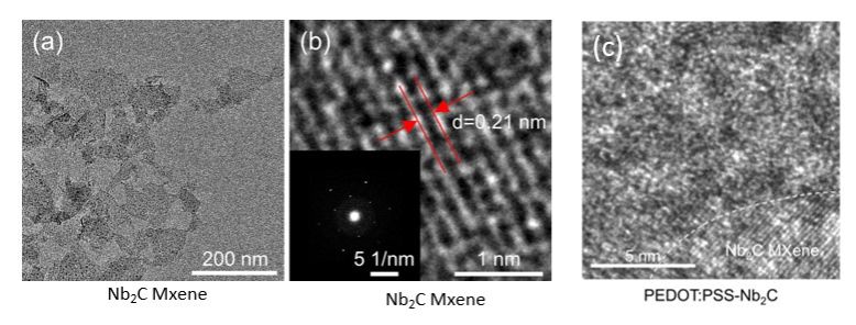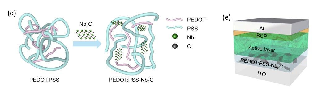 有机薄膜太阳能电池具有低成本、可溶液加工、柔性等优势,是未来柔性电子和智能穿戴领域极具潜力的电源供应者。近日,王生浩&徐韬课题组创新性地提出了一种新型可溶液加工的、基于Nb2C MXene二维材料的空穴传输层(PEDOT:PSS-Nb2C)材料,通过精细控制形貌,器件效率得到了大幅度的提升。电学、形貌、化学组成表征结果表明Nb2C MXene可以提升PEDOT:PSS薄膜的导电性并促进相分离,从而提升活性层的空穴传输速率、电荷提取能力以及降低器件的界面电阻。此外,PEDOT:PSS-Nb2C传输层材料被拓展应用于基于不同非富勒烯体系的器件中,证明了其在提升有机薄膜太阳能电池器件性能上的普适性。该研究在未来民用(如智能穿戴)和军用领域(在特殊环境下为电子元器件提供高功率密度比的电能)均有重要的意义。ac米兰官网中文网站为本文第一署名单位,中欧学院研究生邓宝中为论文第一作者,材料基因组工程研究院的王生浩教授、中欧学院的徐韬副教授和上海高压科学与技术先进研究中心(上海-张江)的董洪亮研究员为论文的共同通讯作者,材料基因组工程研究院的王子涵高级实验师为本工作测试了高质量高分辨透射电镜照片,ac米兰官网中文网站为本文第一署名单位,中欧学院研究生邓宝中为论文第一作者。