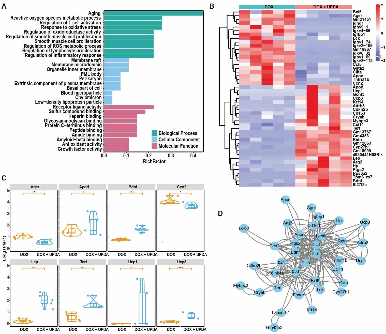 深入探究了UPDA NPs抗氧化应激的调控机制。通过转录组学测序发现在上调的差异基因中,载脂蛋白D (ApoD)能抑制脂质过氧化,对抗大脑中的氧化应激。解偶联蛋白1(Ucp1)是棕色脂肪组织的生物标志物,在衰老过程中表达和活性降低,Ucp1的上调可以抑制炎症小体NLRP3的激活,并保护动物免受冠状动脉粥样硬化的影响。解偶联蛋白3(Ucp3)上调可以抑制线粒体当中ROS的生成,保护氧化应激诱导的器官损伤;端粒酶逆转录酶(Tert)作为一种细胞衰老抑制剂表达上调。瘦素(Lep)是一种维持能量稳态的激素,可以保护超氧化物诱导的氧化应激损伤。在UPDA NPs存在时,瘦素表达增加。脑源性神经营养因子(Bdnf)上调能够维持神经元培养中的氧化还原稳态,而且可以通过抑制NF-κB信号通路抑制衰老小胶质细胞激活。观察NF-κB信号通路,SASPs的主要调控因子、也被确定为UPDA NPs调节的差异基因的丰富通路之一。相应地,在下调的差异基因中,Arger是糖基化晚期终末产物的特异性受体,通过激活NF-κB通路诱发炎症。而细胞通信网络因子2(Ccn2)通过与受体激活因子作用来激活NF-κB通路。总之,研究证明UPDA NPs抵抗氧化应激诱导的衰老与脂质代谢、线粒体功能、能量稳态、端粒酶活性、神经保护和炎症反应相关的多种调节基因有关。