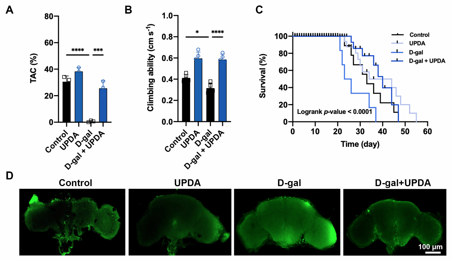 研究人员还测试了另外一种动物模型,通过对果蝇饮食调节发现UPDA NPs可以提高衰老果蝇的抗氧化能力,增强攀爬能力,延长寿命,这可能与防止大脑凋亡有关。由于细胞凋亡本身可由多种因素诱导,如细胞周期抑制剂p16ink4a和促炎细胞因子IL-1β,所以UPDA NPs的抗衰老作用来自不同的抗衰老机制的组合。