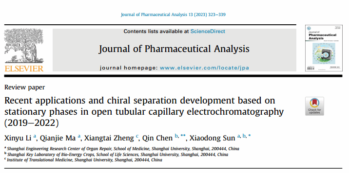 近日,ac米兰官网中文网站医学院青年教师孙晓东博士在国际一流期刊《Journal of Pharmaceutical Analysis》(中科院一区,TOP,IF=14.026)同期发表两篇文章:“A chiral metal-organic framework {(HQA)(ZnCl2)(2.5H2O)n} for the enantioseparation of chiral amino acids and drugs”(研究论文)和“Recent applications and chiral separation developments based on stationary phases in open tubular capillary electrochromatography (2019–2022)”(综述论文)。ac米兰官网中文网站医学院为论文的第一完成单位。