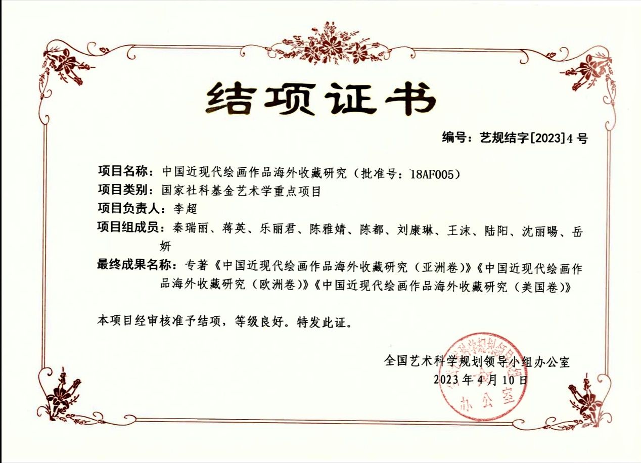课题从立项到结项共历时四年,特别是在疫情封控期间,李超教授敢于担当,充分调动团队协作精神,齐心合力,克服种种困难,最终带领团队完成三卷本结项成果:《中国近现代绘画作品海外收藏研究(亚洲卷)》《中国近现代绘画作品海外收藏研究(欧洲卷)》《中国近现代绘画作品海外收藏研究(美国卷)》。共计57万余字。