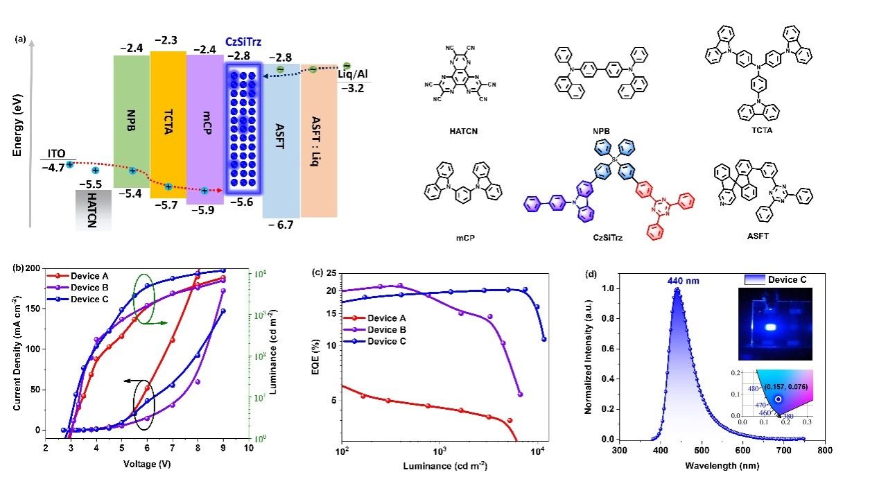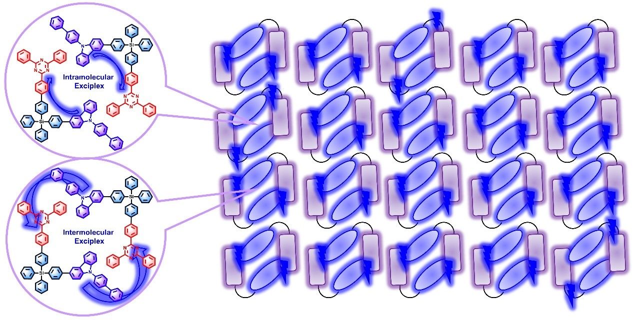 蓝光OLED材料和器件的效率和寿命不能兼顾,是学术和产业界面临的世界性难题。团队设计、制备了用硅原子连接给体和受体片段形成的材料分子,通过光、物理、化学性能的系统表征和构效关系研究,发现CzSiTrz为例的分子可同时产生分子内和分子间的双通道电荷转移发光 (Dual-Channel Intra/intermolecular Exciplex (DCIE) emission)。这种双通道电荷转移过程可通过快速的反系间窜跃(RISC)利用OLED器件中的三线态激子实现高效率发光。