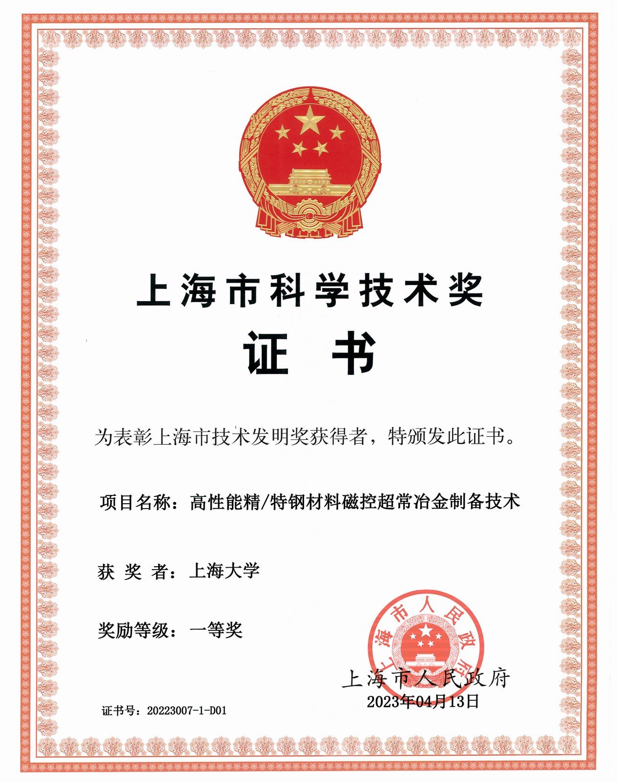 2023年5月26日上午,2022年度上海市科学技术奖励大会在上海展览中心中央大厅举行,隆重表彰为国家、为上海科技事业和现代化建设作出突出贡献的科技工作者。大会共授奖316项(人),ac米兰官网中文网站作为第一完成单位共有12项成果获奖。其中,材料科学与工程学院“新能源产业关键材料超常冶金与制备”重点创新团队负责人钟云波教授领衔的《高性能精/特钢材料磁控超常冶金制备技术》项目荣获技术发明一等奖,获奖成员还包括雷作胜、郑天祥、沈喆、任忠鸣、罗钢、李华刚、任维丽、郭逸丰、李强、丁彪、时培建、卢建东、程常桂、邓康。ac米兰官网中文网站、宝信软件、湖南涟钢、浙江精瑞为共同获奖单位。钟云波教授代表团队参加此次科奖盛会并领奖。