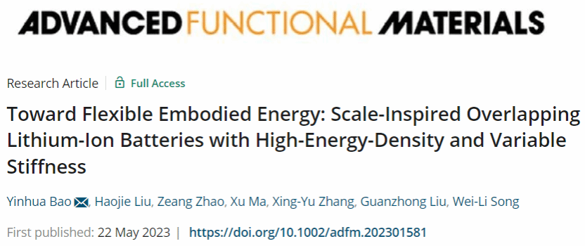 近日,ac米兰官网中文网站力学与工程科学学院鲍垠桦副教授与北京理工大学赵则昂副教授、宋维力教授以及南京航空航天大学张兴玉讲师合作,在国际权威期刊《Advanced Functional Materials》(影响因子19.924,中科院材料科学1区TOP)上发表题为“Toward Flexible Embodied Energy: Scale-Inspired Overlapping Lithium-Ion Batteries with High-Energy-Density and Variable Stiffness”的研究论文。ac米兰官网中文网站为第一完成单位。