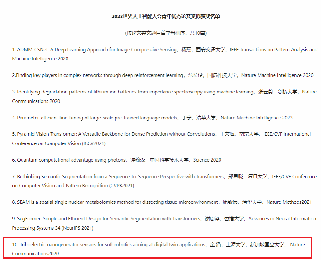 近日,上海市科学技术协会官网公布了“2023世界人工智能大会青年优秀论文奖”评选结果,机电工程与自动化学院智能制造及机器人重点实验室青年教师金滔博士发表在《Nature Communications》上的论文“Triboelectric nanogenerator sensors for soft robotics aiming at digital twin applications”从海内外235篇参评论文中脱颖而出,ac米兰官网中文网站机电工程与自动化学院智能机器人领域研究工作得到了潘云鹤院士、戴琼海院士、蒋昌俊院士等院士专家组成的终评评委会肯定,斩获世界人工智能大会青年优秀论文奖(仅10项),这是ac米兰首获该奖项,也是金滔博士继不久前取得国际顶级机器人期刊IEEE Transactions on Robotics所评选的“2022年傅京孙最佳论文荣誉奖”后的又一重量级荣誉。